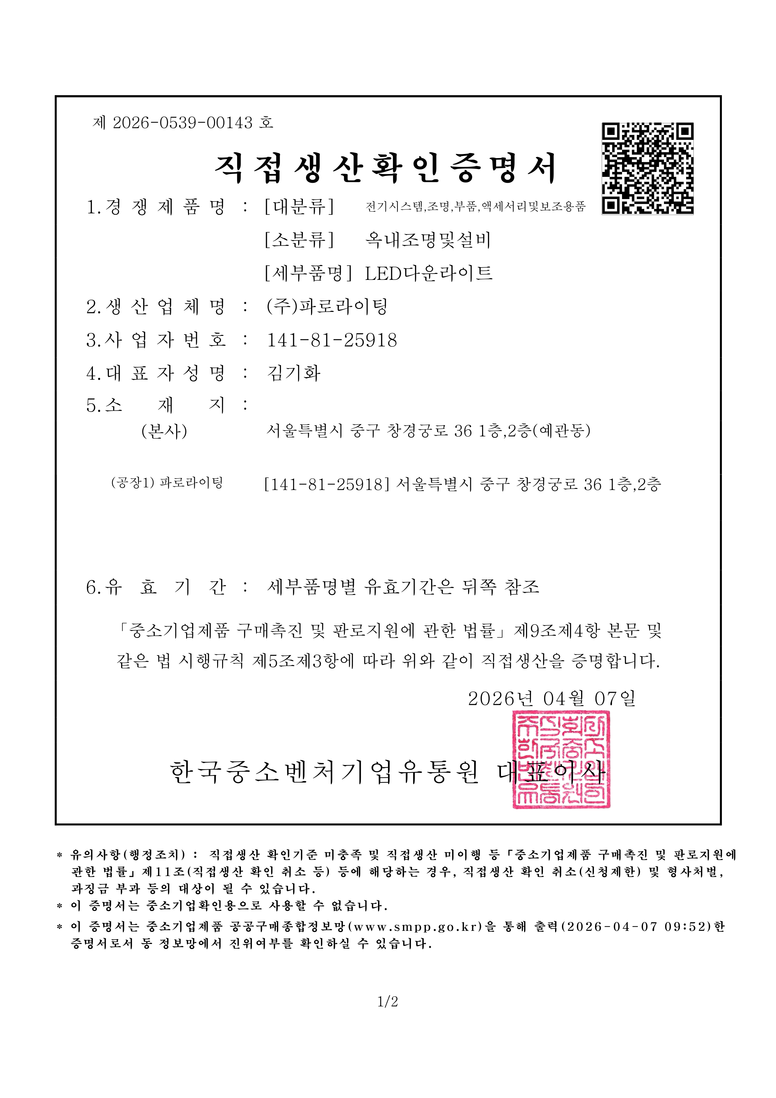 직접생산확인증명서(다운라이트)